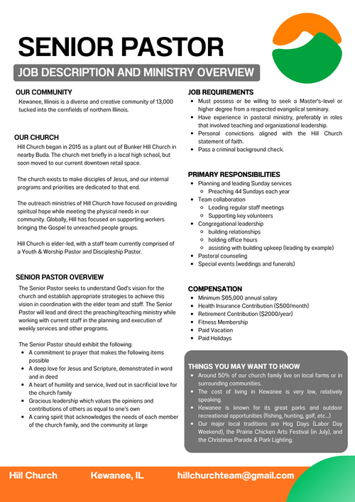 We are grateful you have taken the time to learn about our open position for Senior Pastor. If after reading the job description you believe you may be a fit within our church family, we look forward to hearing from you.